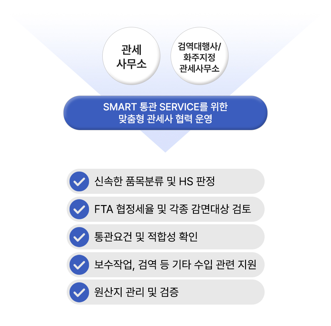 Export-Import Customs Brokerage Service 수출입 통관 서비스 SERVICE 03 수출입 통관 서비스 수출입 통관 대행 서비스(관세 환급) 수출입 통관대행 서비스 · 세관 신고, 서류 작성, 원산지 증명, 관세 납부, 물류 연계 등 절차 대행 서비스· 신속성, 정확성, 법규 준수, 비용 효율성 달성을 위한 물류 전문 서비스 전략