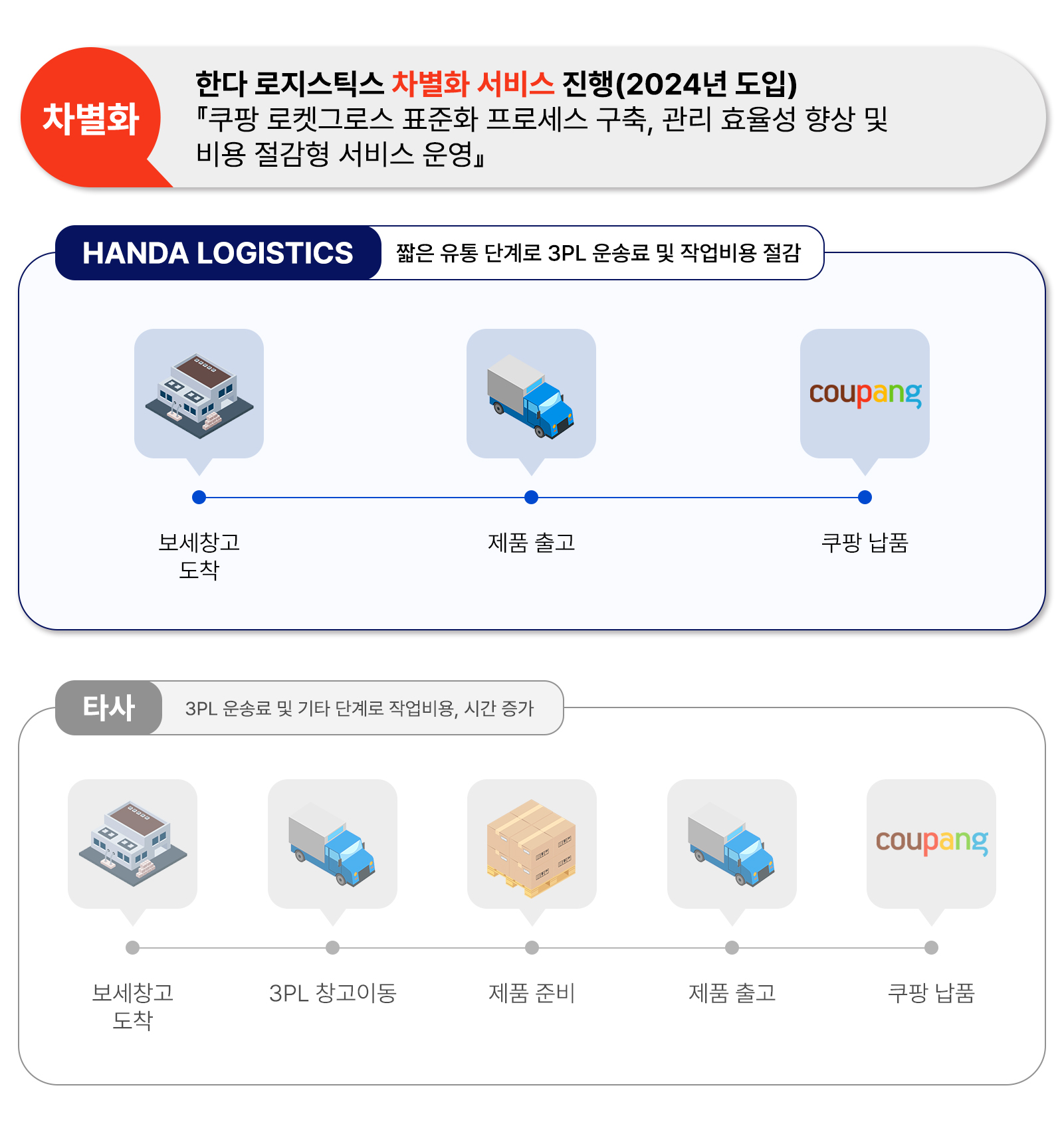 Coupang Rocket Growth Agency Service 쿠팡 대행 서비스 SERVICE 05 쿠팡 대행 서비스 쿠팡 로켓그로스 대행 서비스 관리 효율성 향상 및 전체 비용 절감형 서비스 운영(전담팀 운영) · 입고 표준화 프로세스 구축, 물류 네트워크 최적화. 쿠팡 전담팀 운영을 통한 사전 교육 실시 및 효율 극대화(업무방개설) ☞ 장점 : 물류단계 간소화로 제품 파손 및 재작업율 감소 작업 흐름 최적화를 통한 운영 효율 증대, 전반적인 비용 절감 효과 ☞ 단점 : 파렛트 단위 물류 이송 적용 시 부피 증가로 물류비용 소폭 상승